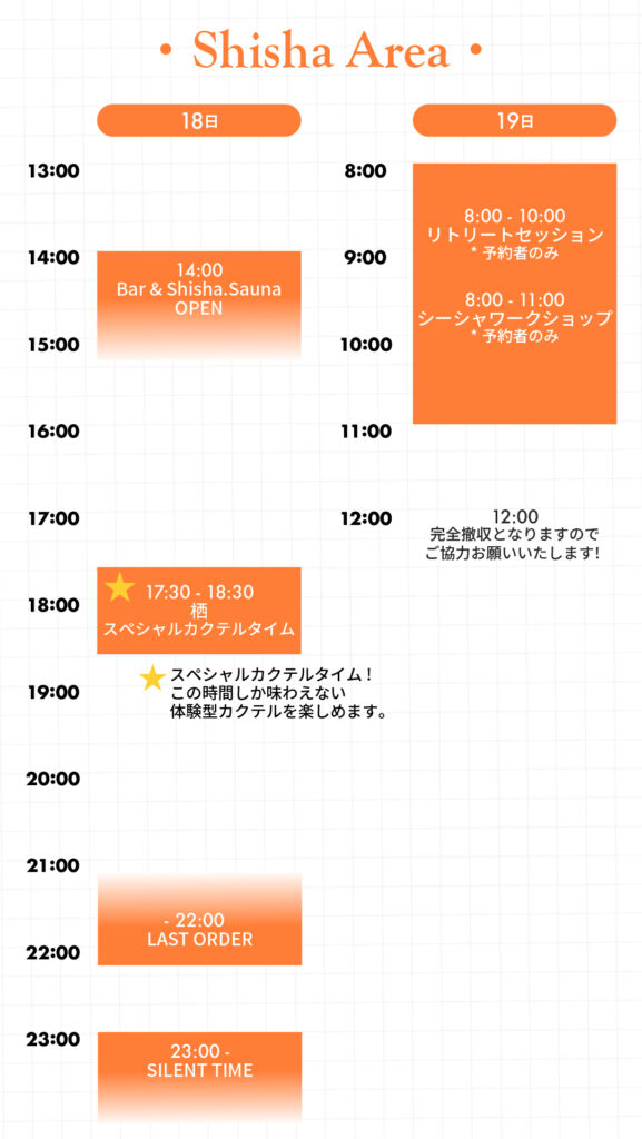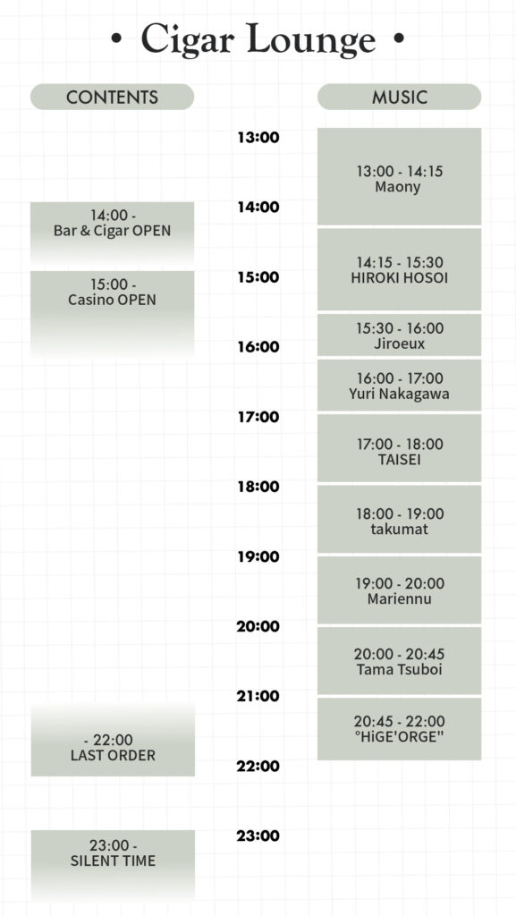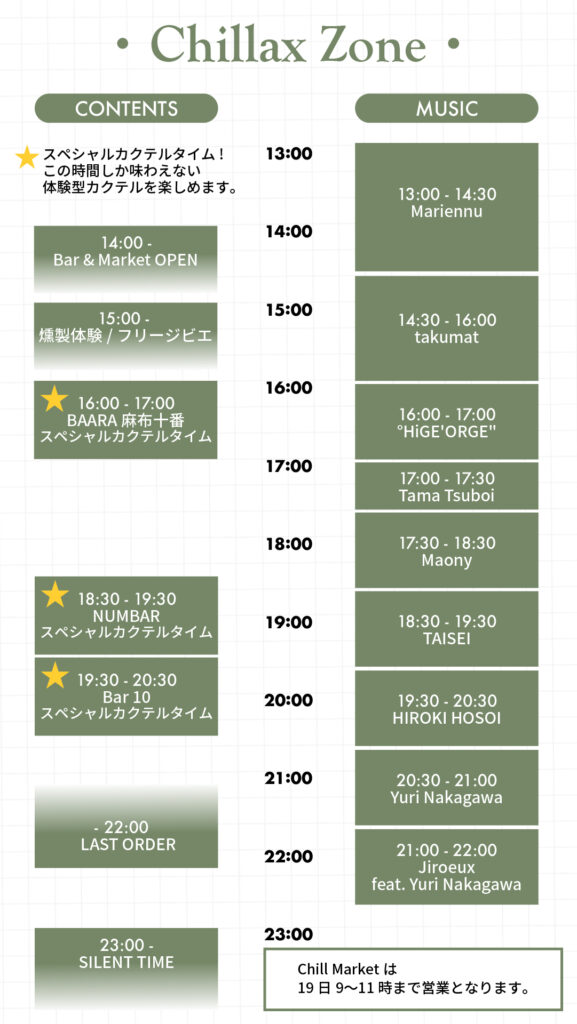 Area Chillax Zone Cigar Lounge Shisha Area Chill Market Chillax Zone Cigar Lounge Chill Market Shisha Area YOHAKU Chillax Zone 満ちすぎない開放感。 都会の感性と自然がゆるやかに交わるチルエリア。 麻布十番から3店舗のバーテンダーが集結し、DJの音に包まれながら、森の中でゆったりとお酒を楽しむことができます。 ストーブカーでの焚き火のぬくもりと音楽がほどよく溶け合う、大人のための余白空間です。 Stove car ほむらびと-焔火人- (群馬) ゆらめく焔に囲まれた 心和む暮らしと共に ユーザーさまに寄り添う 身近な薪ストーブ屋さん Bar View More IZANAI Cigar Lounge 誘うのは、静かな贅沢。 ゆっくりと漂う葉巻の香り、心地よく流れるDJの音楽。それはまるで、日常から抜け出すための静かな誘い。このラウンジには、鎌倉・由比ヶ浜からやってきたこだわりのバーが登場。海辺の風を知るバーテンダーが、森の中で上質な一杯を。静けさと刺激が交差する、大人のための深い一杯と一服をお楽しみください。 Cigar & Bar The CLUB (鎌倉由比ヶ浜) 自然の中で、葉巻と一杯の贅沢を。『The CLUB』は、由比ヶ浜の人気バーがチルスモに出店。森に包まれたキャンプ場で、上質な葉巻とともに、洗練されたドリンクを楽しむ特別なひとときをお届けします。潮風の記憶を胸に、自然とととのう、大人のリラクゼーションを。 Cigar Menu Cigar 2,000円〜・Davidoff・Zino・Camacho・Habanos※銘柄・価格については当日スタッフにお尋ねください。Alcohol・アードベッグ・グレンモーレンジ・ヘネシー・シャンパーニュ View More TOTONOU Shisha Area 整いのその先へ。 ここは、熱と香りが交差する、“深呼吸の楽園”です。 静かに汗を流し、余計なものがそぎ落とされていくサウナの時間。その後に待つのは、ゆっくりと香りをまといながら味わう一杯のシーシャ。整いのその先にある、もう一段深いリラックスへと誘います。気持ちを込めて作れば、美味しいだけで終わらない。心を動かすシーシャを、ここでお届けします。あなたの日常に、少し贅沢な深呼吸を。 Bar View More Shisha & Sauna KENTO from YANBARU CHILL STUDIO (沖縄) 本格的にシーシャ文化が広まる前の東京で、1店舗目を立ち上げ、その後昨年夏に沖縄北部・亜熱帯の自然に抱かれたサウナとともにJUNGLE SHISHA LOUNGEをオープン。 シーシャアーティストとして全国の有名店のプロデュースや技術指導を行っており、心を動かすシーシャを提供し、香りを通して深いリラックスを届けています。 Drink&Food Menu Drink ・自家製チャイ(hot/ice) ・ヤンバルハーブレモネード(hot/ice) ・ヤンバルウコンジンジャーエール(hot/ice)・ビネガードリンク+ヤンバルドリンク(早摘みシークワーサー)・日本茶など Food ・アイタルシチュー&ライス ・おにぎり(お茶漬けも可) Shisha &Sauna Menu Contents テントサウナ&フリーシーシャ 3,000円(滞在中入り放題) ヤンバルハーブを使ったセルフロウリュウが楽しめる薪ストーブサウナ。フリーシェアシーシャが吸い放題。サウナに必要な水着・タオルなどはご自身でご用意お願いします。 スペシャルシーシャ(バンガローのみ出張も可) 3,000円/1台 + シェアチャージ1,000円/1人 今日の気分にぴったりの香りをブレンド。日本屈指の最高クラスシーシャを特別なロケーションで楽しめます。 Work Shop Contents リトリートセッション19日8:00~10:00 【要予約】20,000円/1人 30,000円/2人 日々の忙しさやストレス、溢れる情報から一歩離れ、“心と体に余白”を取り戻すための朝時間。このリトリートセッションでは、サウナ、外気浴、ストレッチ、サウンドバスなどの五感を整え、自分の内側と静かにつながるためのプログラムをご用意しています。 View More シーシャワークショップ19日9:00~11:00 【要予約】8,000円/1人(シーシャ、マイマウスピースプレゼント) アウトドアシーシャ、家シーシャを作れるようになろう!初心者の方でも簡単にお店のクオリティーのシーシャが作れるようになる機材や作り方を皆さんに惜しみなくレクチャーします。 プロの講師に手取り足取り教えてもらいながら自分で吸うシーシャをご自身で作ってもらいます。 View More KOU Chill Market 香りに触れる。 こだわりのオリジナルアイテムが並ぶマーケットエリア。 本イベント主催ブランドkaze laboによる日本製スモークギア「煙頭 -smoke head-」をはじめ、JHANAのアロマキャンドルやフレグランス、michelの自然栽培ハーブティーなど、上質な余白を感じるアイテムが揃います。 CHILLAX SMOKE オフィシャルストア×Blimp Club南青山、骨董通り沿いの地下に位置する隠れ家レストランバー。当日はkazelaboのシグネチャーカクテルを1杯、生ビール、ジビエソーセージの販売をします。※22時までの営業となります。 kaze labo本イベント主催のブランド。手のひらサイズのスモークギア「煙頭 -smoke head-」を展開。 煙と香りで空間に“余白と遊び心”を添えるブランドです。 アウトドアやBAR、自宅など幅広いシーンで活用されています。 JHANA誰もが抱える不安や苛立ち。その感情の波を少しでも柔和できたら…そんな